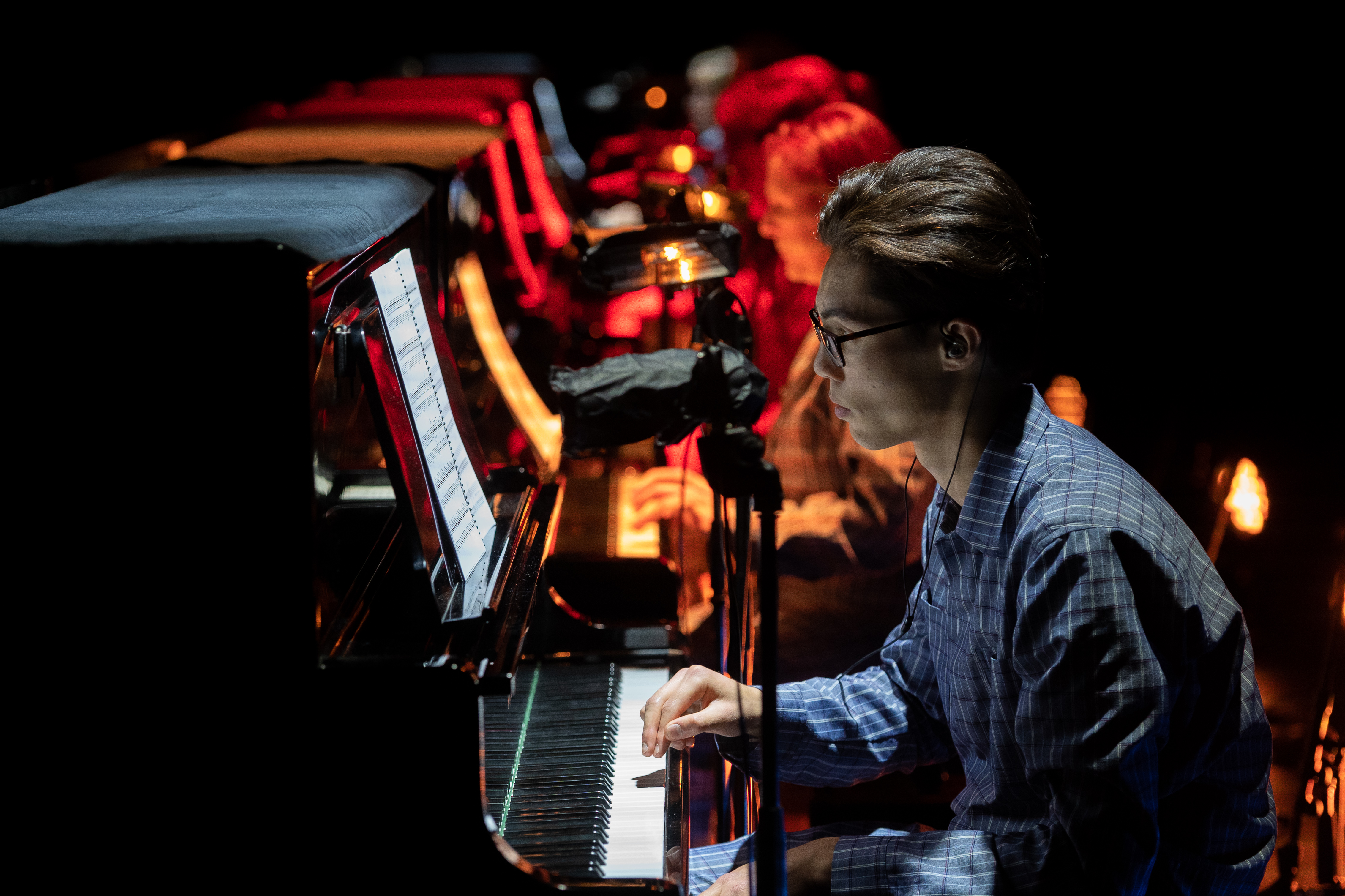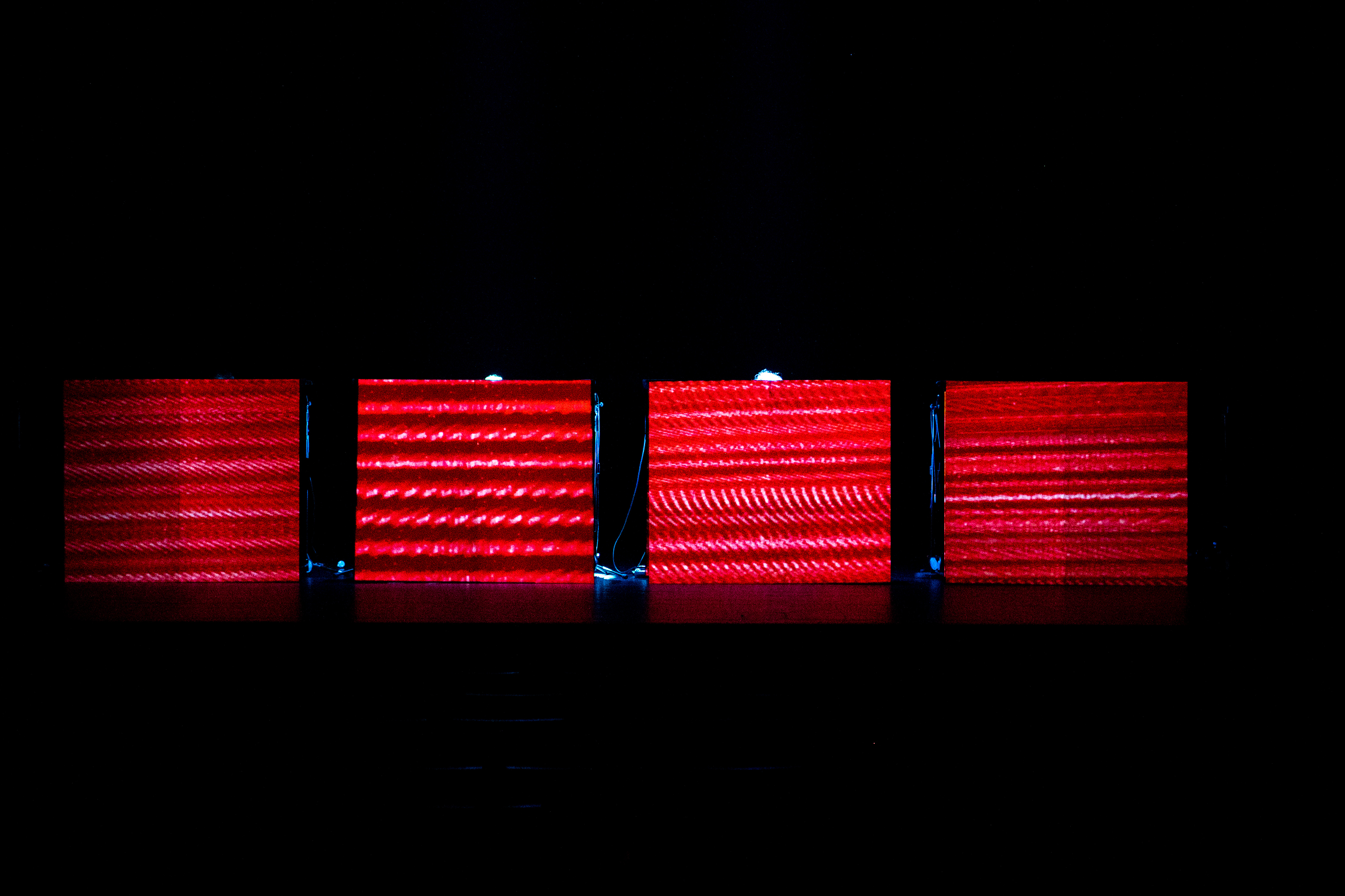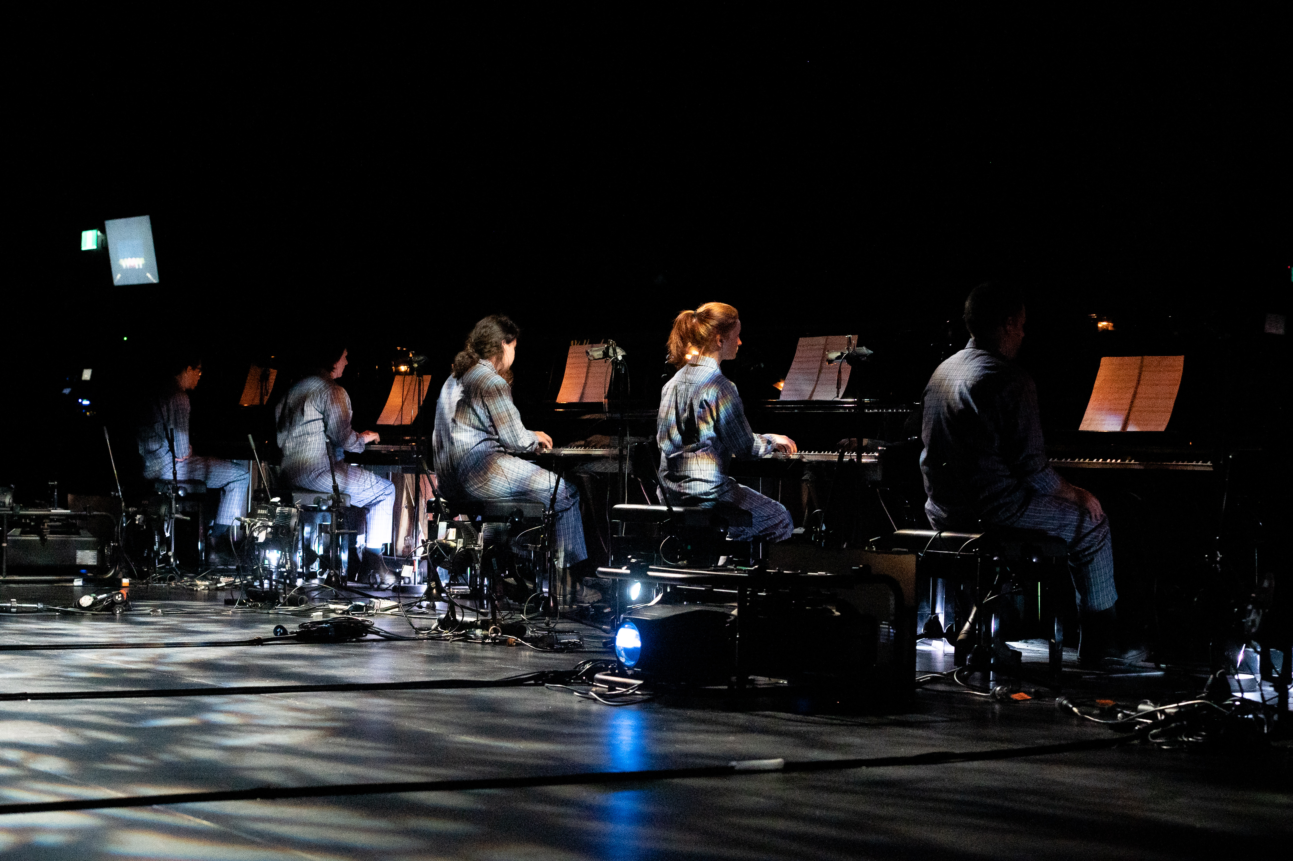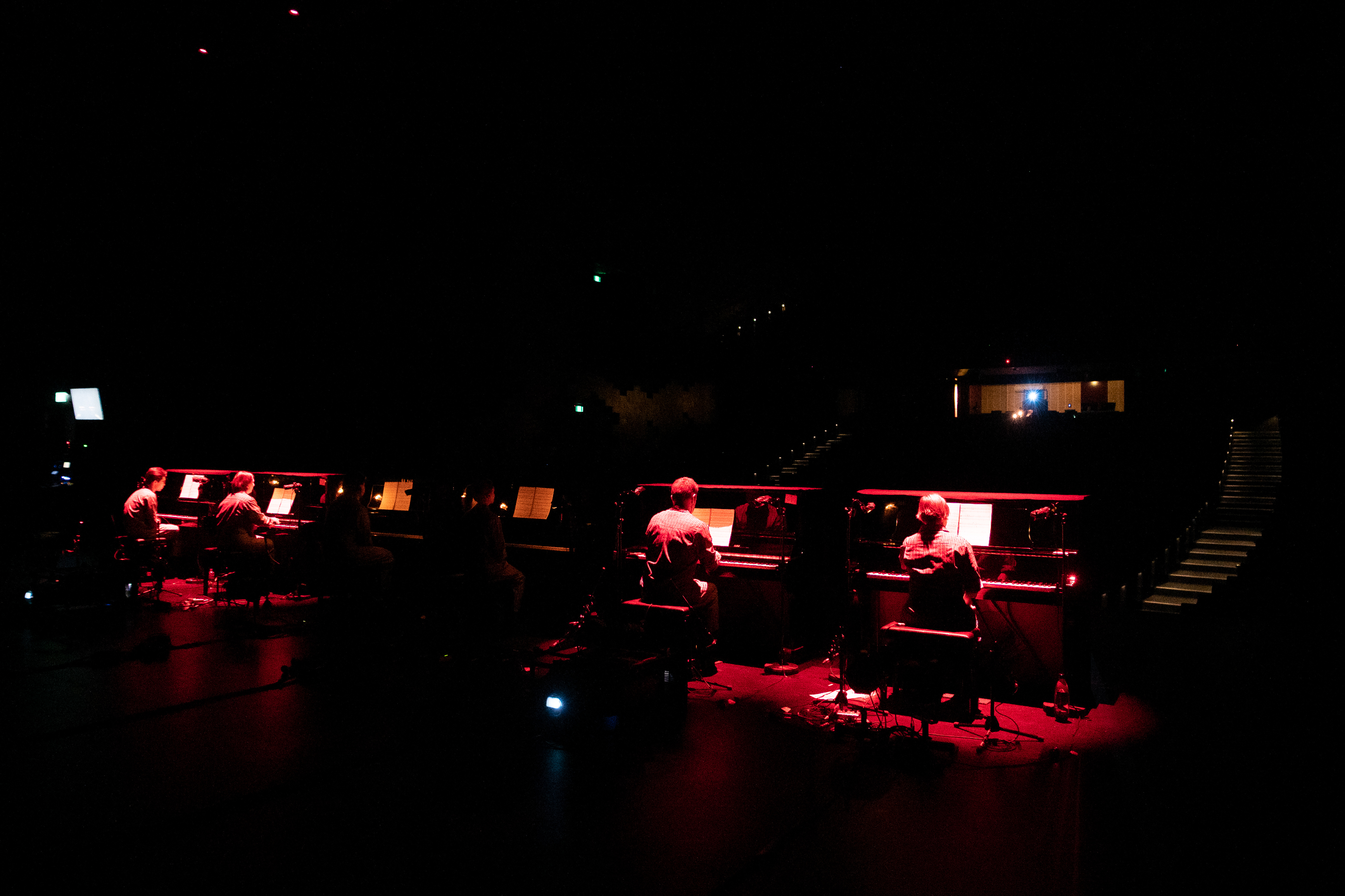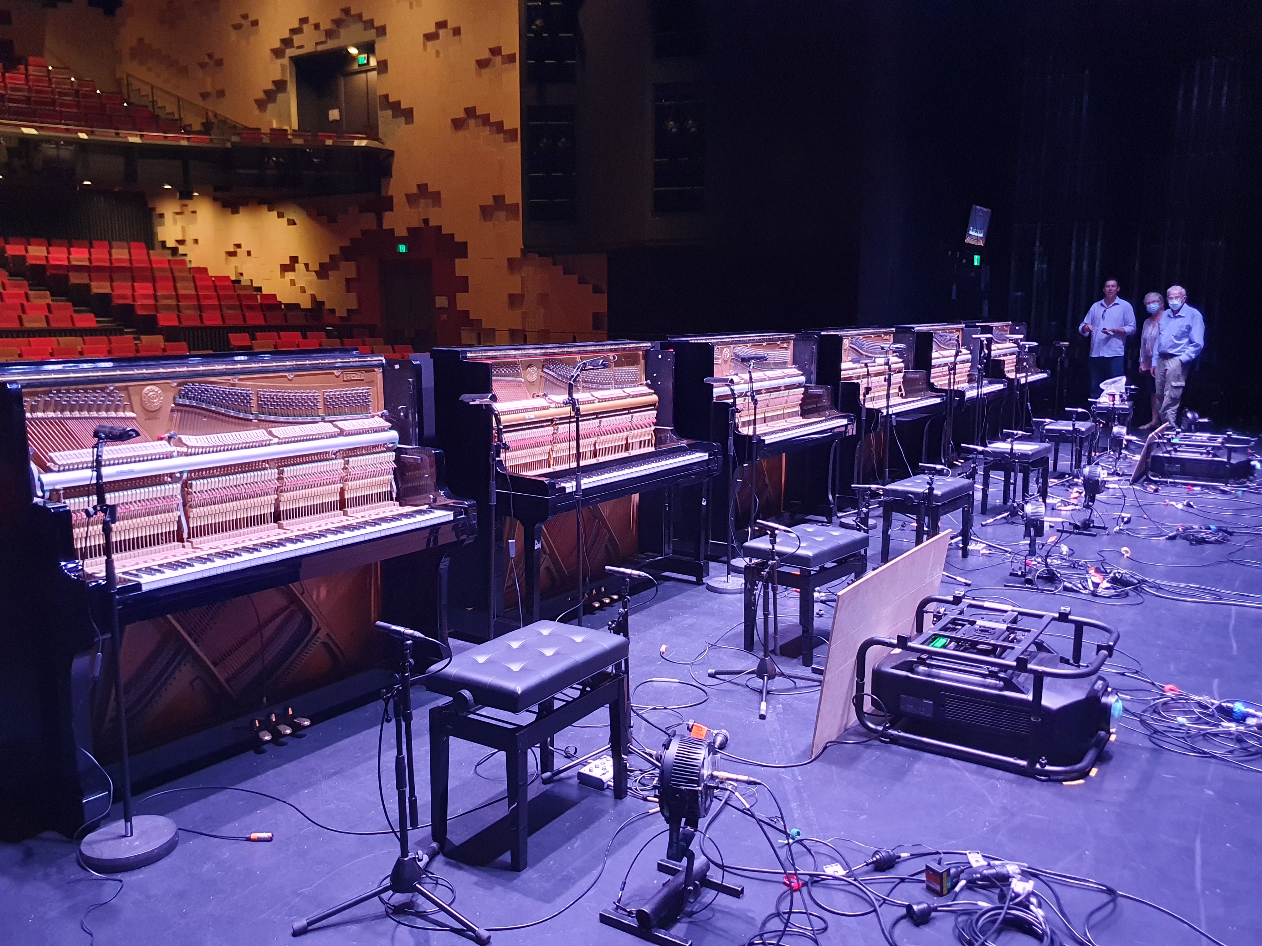 On stage, the backdrop is a floor to ceiling video screen. In front of that, the six (upright) pianos, backs facing the audience, are lined up across the stage forming a wall of sound and acting as six individual screens.