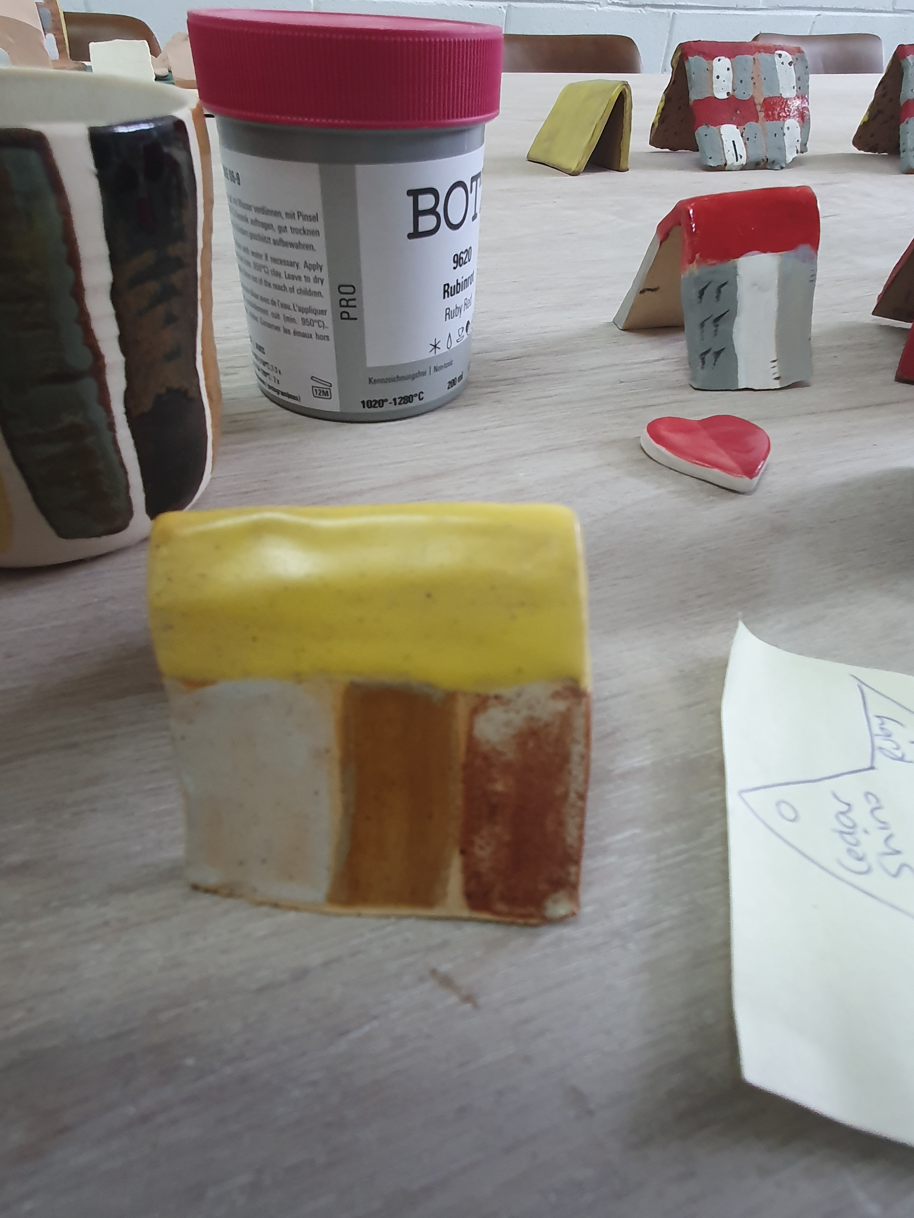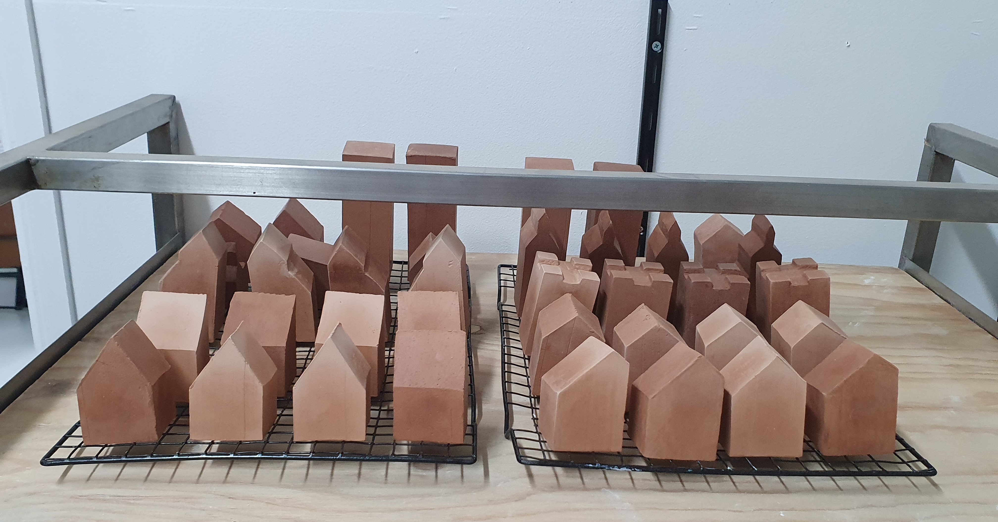 The villages also function as a fully playable chess set. Traditional chess hierarchies—pawns, knights, bishops, kings and queens—are reimagined as houses, stables and cathedrals, transforming an abstract strategy game into a spatial, narrative experience. One village is constructed from dark clay with red-glazed roofs; the other from pale clay with yellow roofs, reinforcing visual contrast and symbolic opposition. Felt will be added to the base of each piece, emphasising care, longevity, and use.